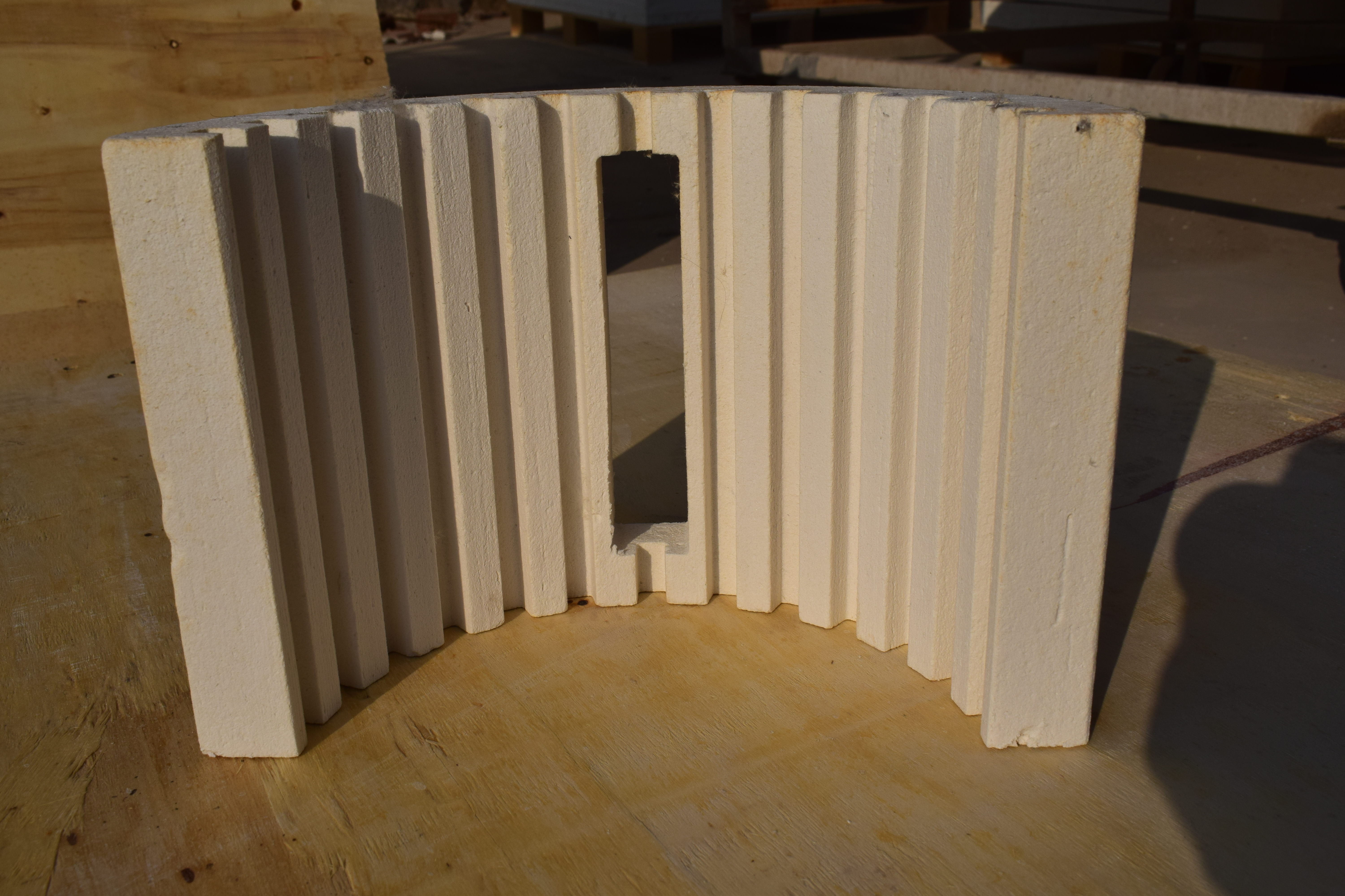3.輕量化與高強(qiáng)度兼顧:相較于傳統(tǒng)耐火磚(密度約2000kg/m?),陶瓷纖維擋火板密度僅為其1/10-1/8,大幅降低設(shè)備承重負(fù)荷;同時(shí)經(jīng)特殊固化處理后,產(chǎn)品抗壓強(qiáng)度可達(dá)1.5-3.0MPa,抗折強(qiáng)度≥0.8MPa,不易碎裂,便于運(yùn)輸與安裝。
